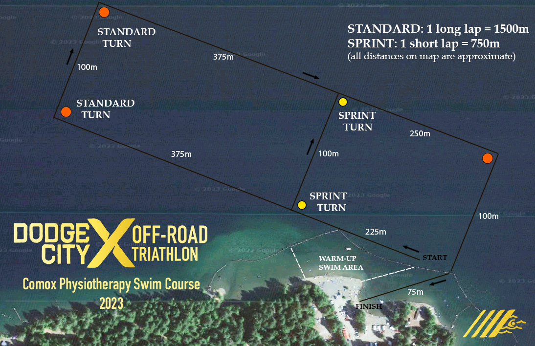 The Dynamic Spine, Sport & Wellness Swim Course features a wet start beyond the booms and a return to shore through the “jellybean exit.” Standard and Relay participants do one long clockwise lap (1,500 m total).